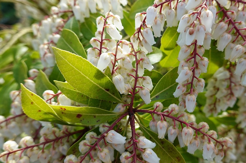 La Pieris japonica è un arbusto ornamentale sempreverde appartenente alla famiglia delle Ericaceae e fiorisce da febbraio ad aprile. La fioritura è abbondante e molto decorativa. I fiori sono piccoli, riuniti in lunghe pannocchie pendule che possono raggiungere i 15–20 cm di lunghezza. Il colore varia dal bianco candido al rosa tenue, talvolta con sfumature crema. Sono leggermente profumati e molto apprezzati dagli insetti impollinatori. Le foglie sono coriacee, lucide e di colore verde scuro, ma le giovani foglie che spuntano in primavera hanno colore rosso bronzeo che spicca sulla pianta. In seguito diventeranno verdi.